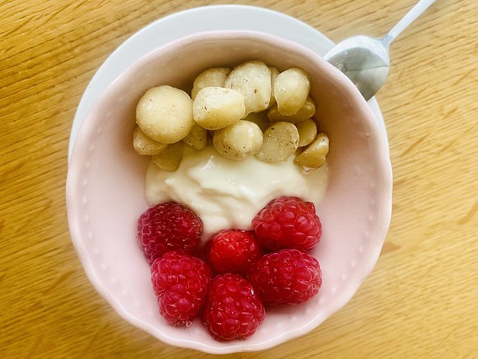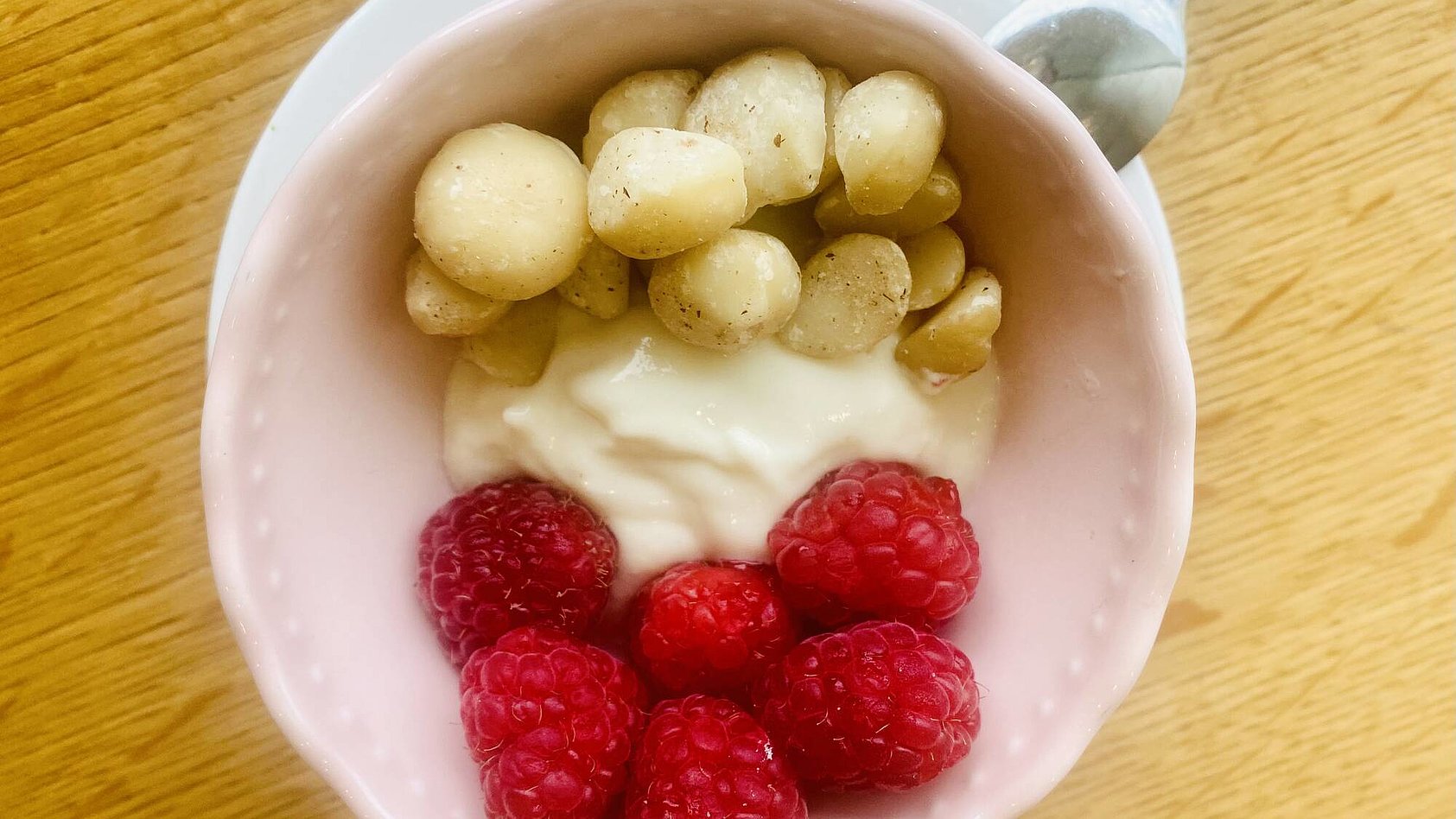 Ricostituire Ketobiota Kanso con acqua q.b. (in base alla consistenza desiderata) e farcire la crema con lamponi freschi e granella di macadamia.