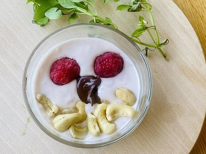 - In una ciotola prepara KetoBiota seguendo le istruzioni per diluzione semisolida (per 13 g di polvere di KetoBiota circa17 ml di acqua) e aggiungi la panna da cucina alla soia (14% di grassi) e il KetVit. Mescola bene.
