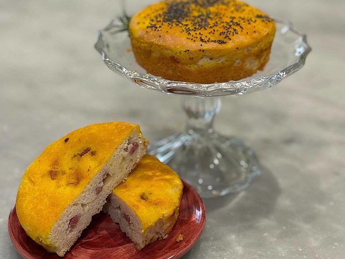 - Per la focaccia rustica farcita: prelevate circa 70 g di impasto, dividetelo a metà, ungete uno stampo da tortina di circa 8-10 cm e, con le mani bagnate, stendete la prima metà. Farcite con il ripieno: 5 grammi di mortadella e 10 grammi di formaggio e richiudete con l’altra metà. Dovreste riuscire a formare 3 focaccine, di circa 90 grammi ciascuna.