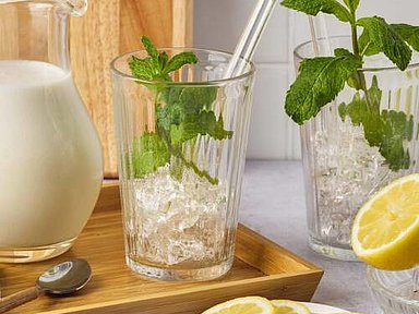 - A seconda delle necessità, mettere dei cubetti di ghiaccio in una caraffa o in un distributore di limonata, aggiungere a piacere le fette di limone e qualche rametto di menta, quindi versarvi sopra la limonata appena preparata.
