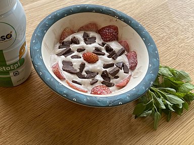 Versa il frullato di panna e KetoEpi Kanso in bicchieri o ciotole individuali. Guarnisci il frullato con le fette di fragole fresche e spolvera le scaglie di Cacaobar Kanso sulla parte superiore. Le fragole fresche e le scaglie di cioccolato renderanno il tuo dessert ancora più invitante.