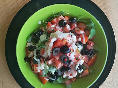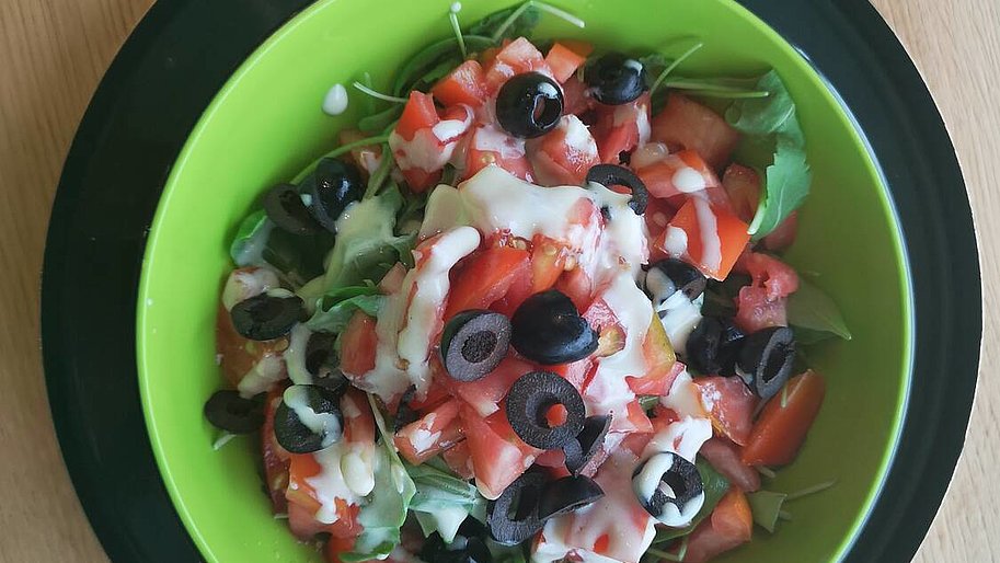 Insalata di rucola e pomodori con salsa allo yogurt e olive verdi