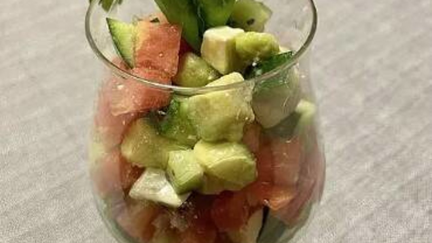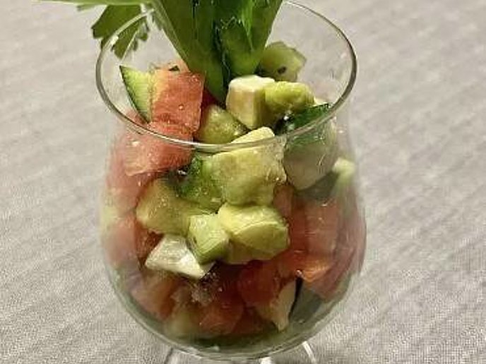 - Mettere l'avocado, il cetriolo e il pomodoro tagliati a cubetti in una ciotola.