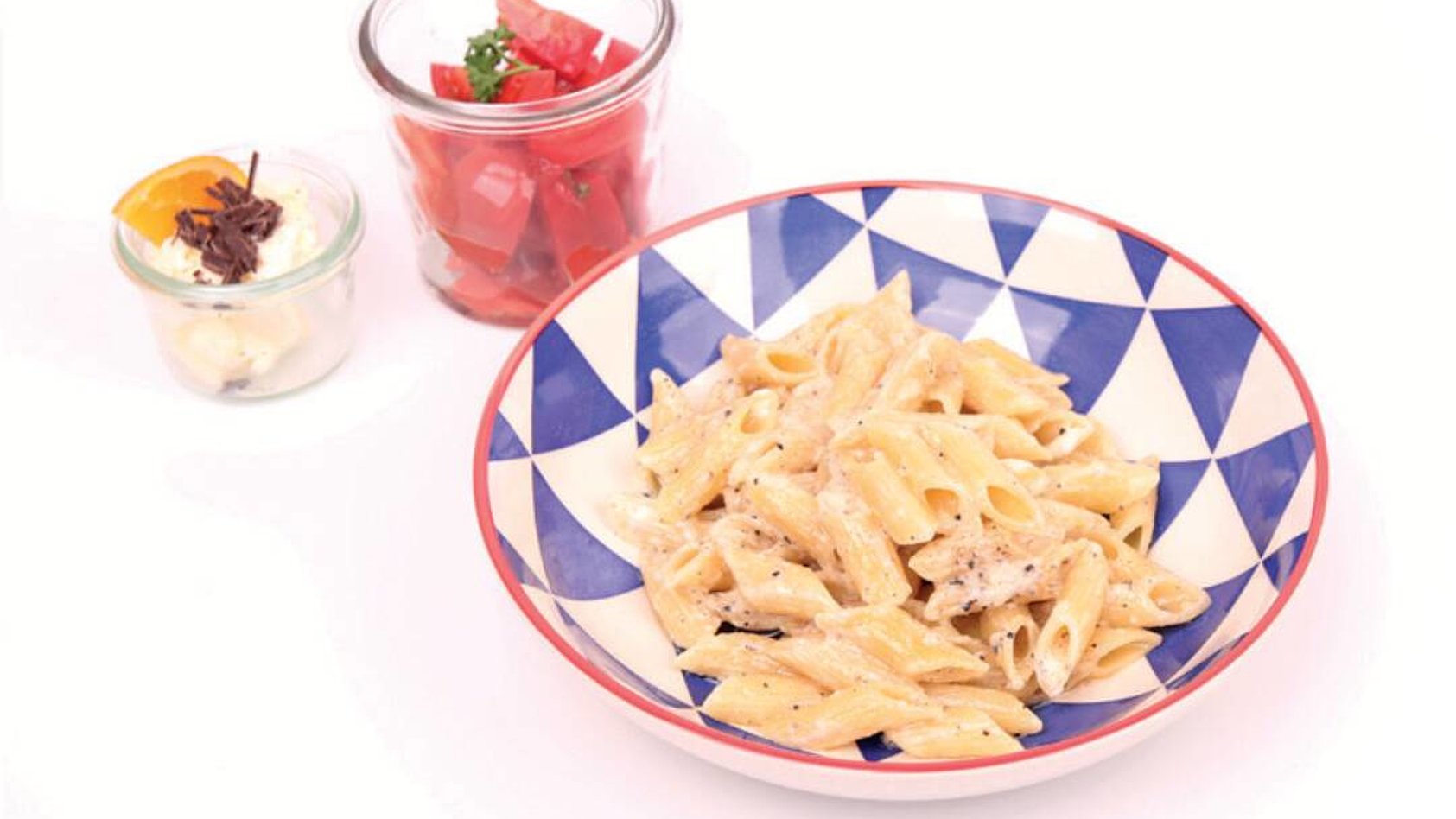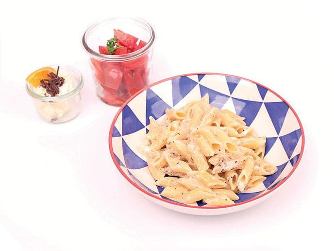 Pasta cacio e pepe con bavarese alle arance