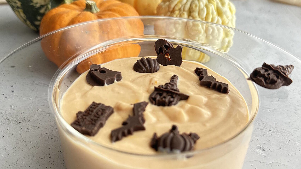 8. Preparare le decorazioni: Sciogliere la Kanso CacaoBar e versarla in formine a tema Halloween. Lasciare solidificare in frigorifero, poi guarnire il dessert con le figure di cioccolato prima di servire.