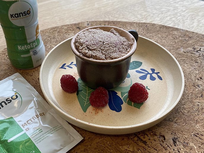 - Amalgamare in una tazza l’uovo sbattuto con KetoEpi Kanso, poi incorporare la farina di cocco, i lamponi freschi e MCT Fiber Kanso.