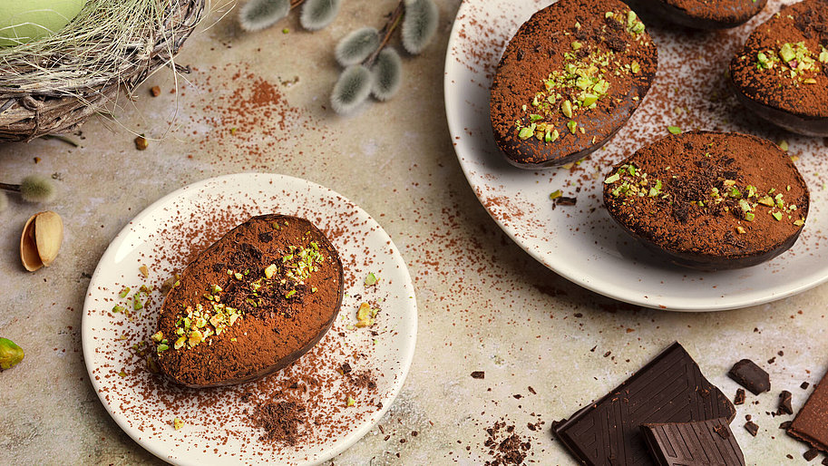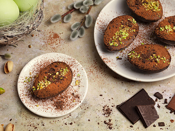 7. Togliere delicatamente le uova di cioccolato dallo stampo in silicone, cospargere di cacao e pistacchi tritati finemente.