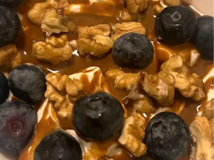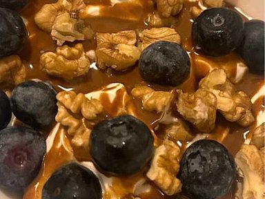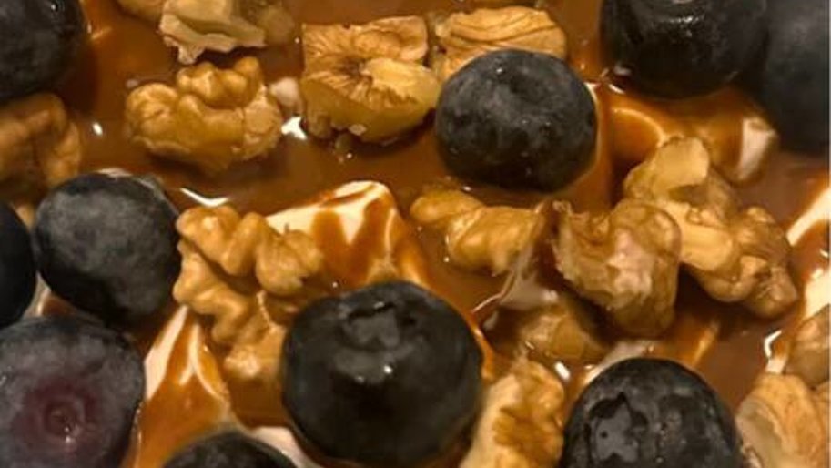 Yogurt greco con MCT Fiber, crema di nocciole, mirtilli e noci