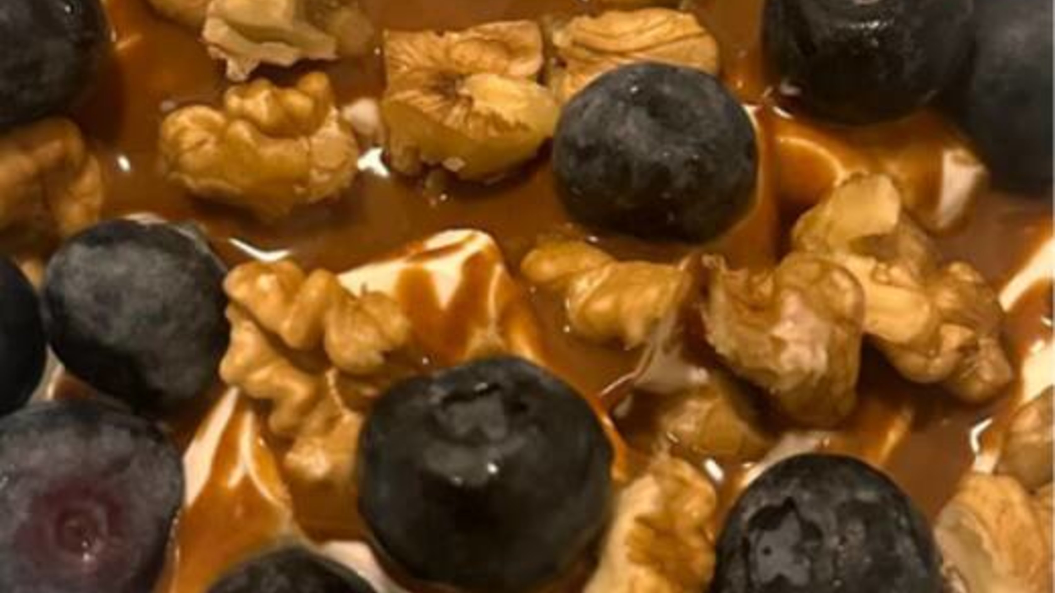 - Aggiungi la crema alla nocciola , le noci spezzettate e i mirtilli neri alla miscela di yogurt.
