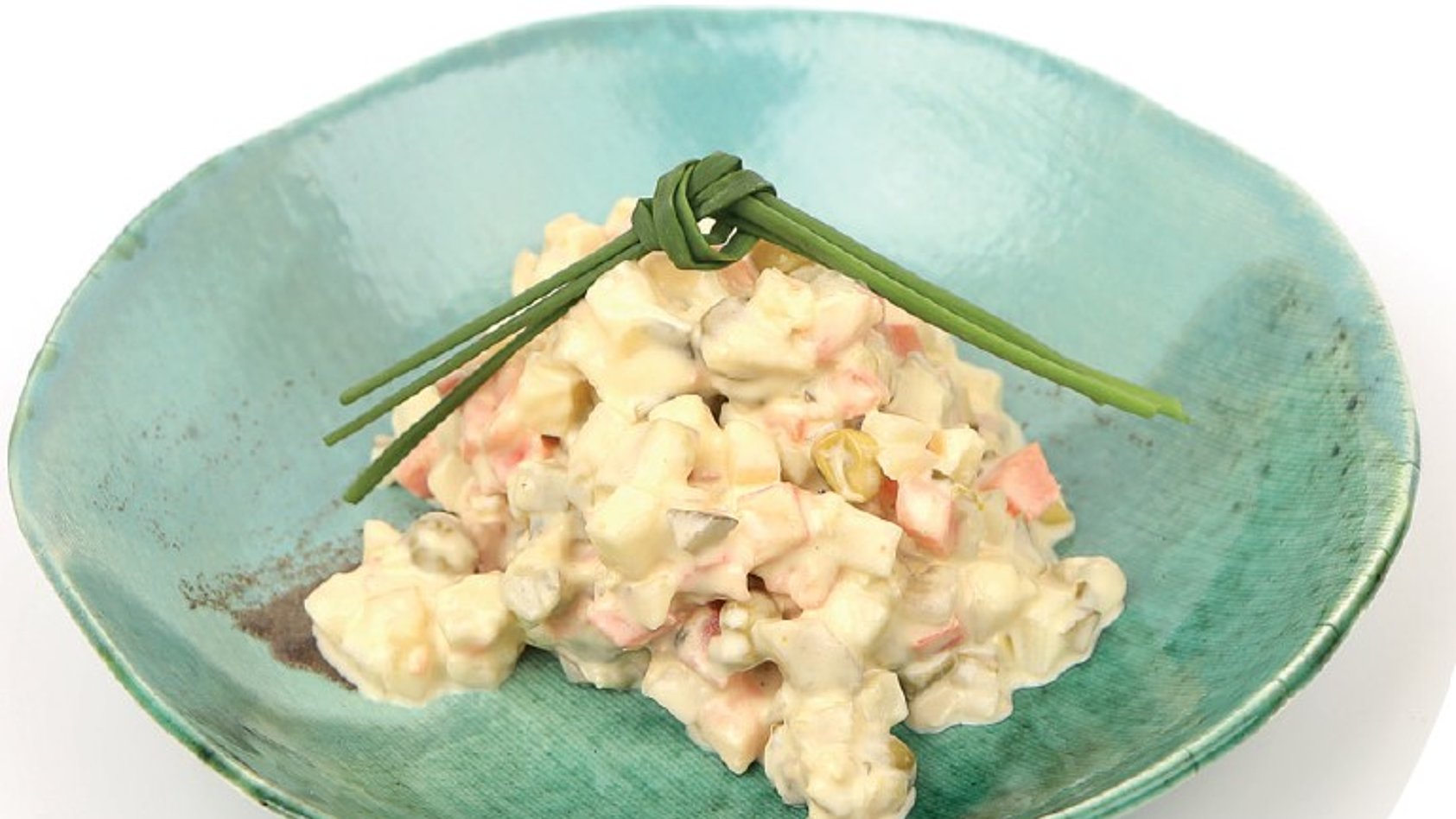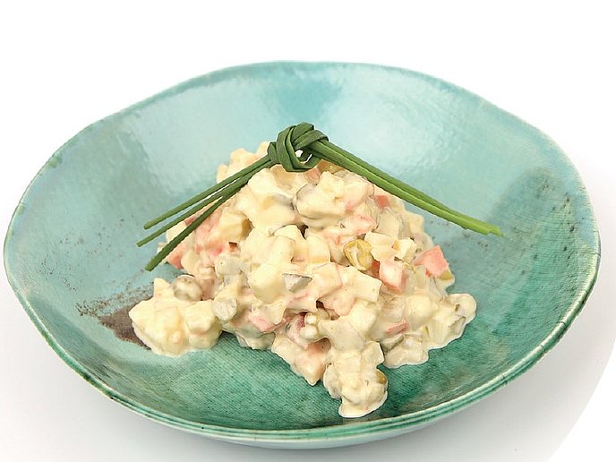 Ponete l’insalata russa in piccole coppette, mettetela in frigorifero per almeno un’ora ad insaporirsi e a raffreddare.