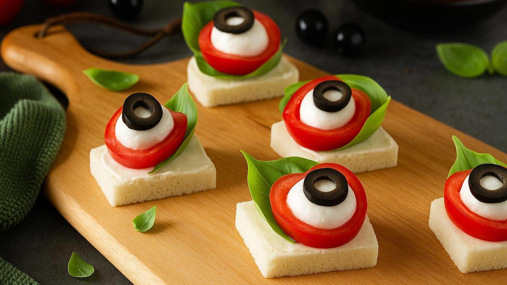 - Su ogni pezzetto di pane, adagia una foglia di basilico e sopra metti un pomodorino farcito.