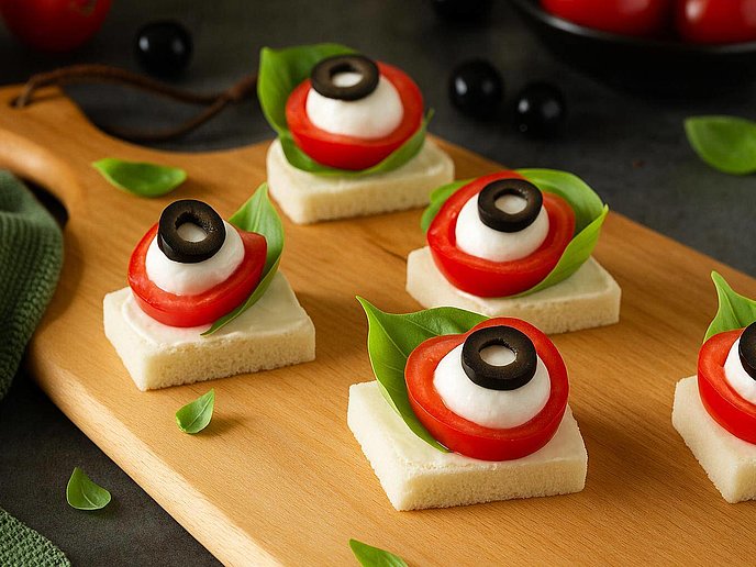 - Riempi le metà dei pomodorini con un po’ di DeliMCT Cream, aggiungi sopra una mezza mozzarella e completa con una fettina di oliva.